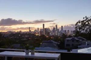 The property sits on the Brisbane River, with a private jetty and ideal city skyline views.