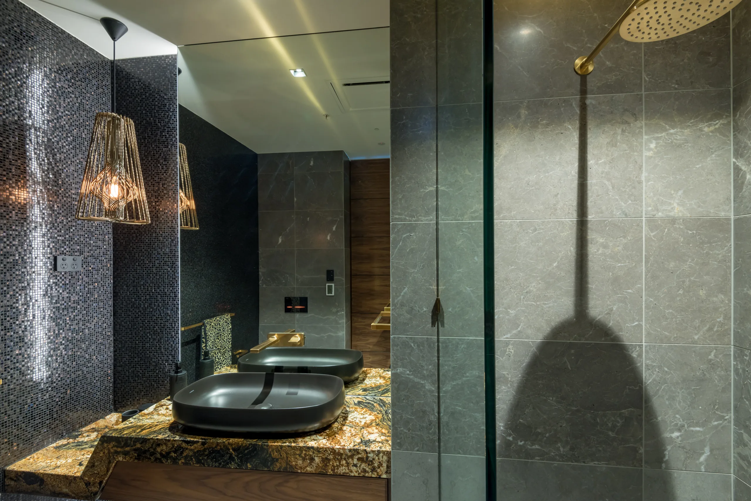 But why look outside? Inside is a blend of black, white and gold accents, opulent Italian marble, intricately adorned archways, custom tiles, vaulted ceilings, Venetian glass tapware, and hand-painted wallpaper, while Venetian plaster and brass also feature heavily.
